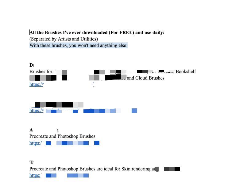 - A Google Docs with links for all the Brush Set's I've ever downloaded which are all FOR FREE and the name of each Artist that made them. I've used this brushes for 6 years and I promise you, you don't need anything else but these!